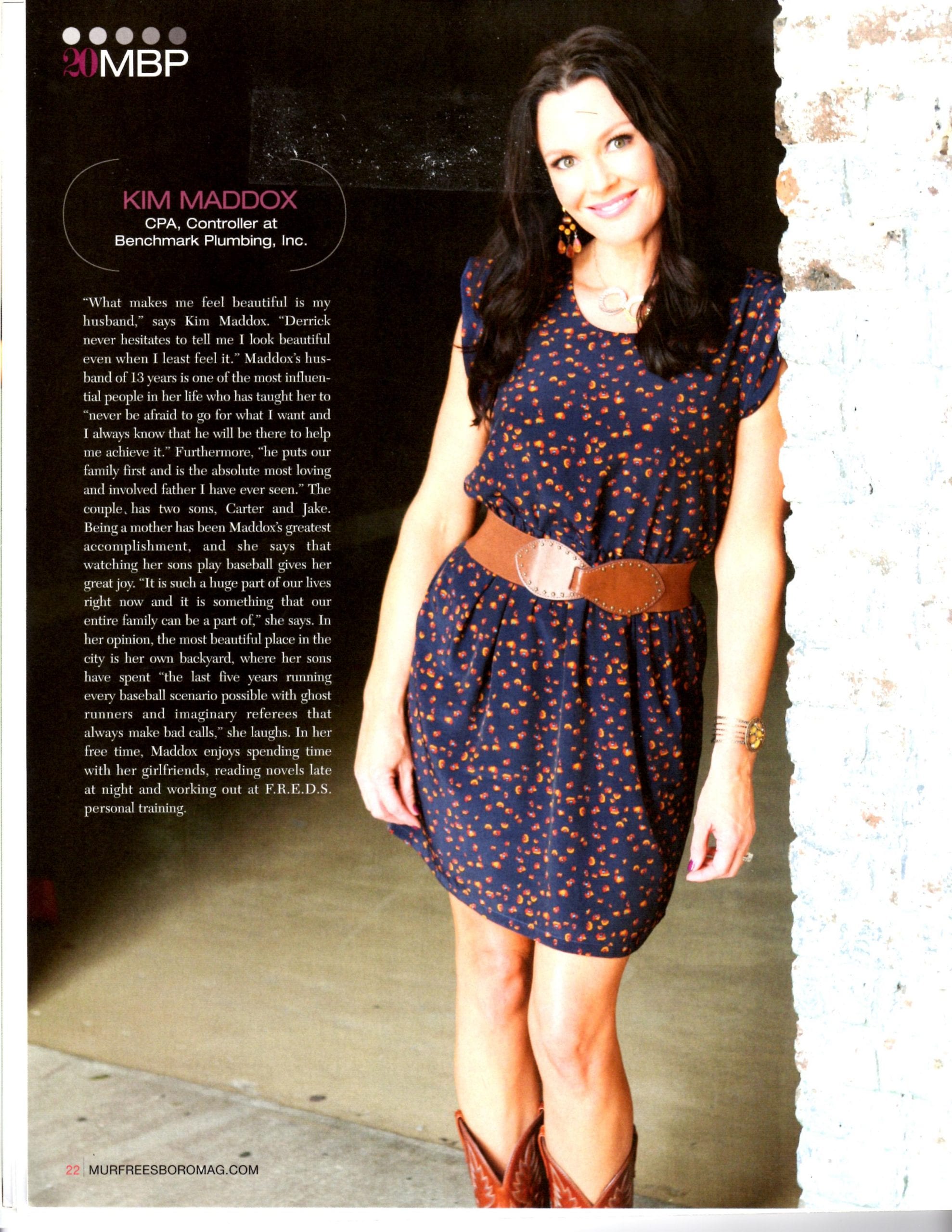 Kim Maddox, CPA Controller at Benchmark Plumbing, Inc., was named one of the 20 Most Beautiful People by Murfreesboro Magazine. Look at our stylish client rocking a dress from e.Allen boutique. Congratulations Kim!!