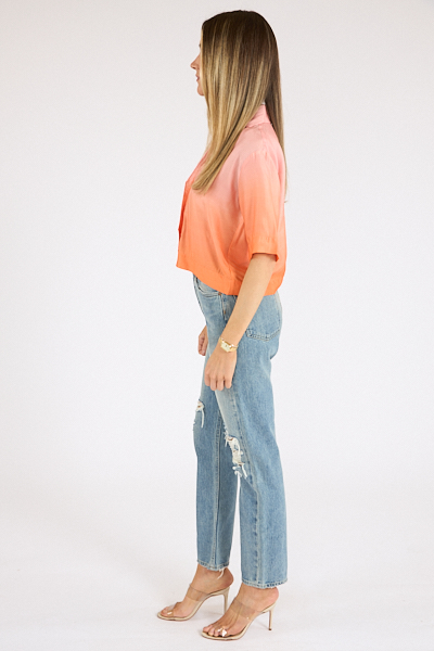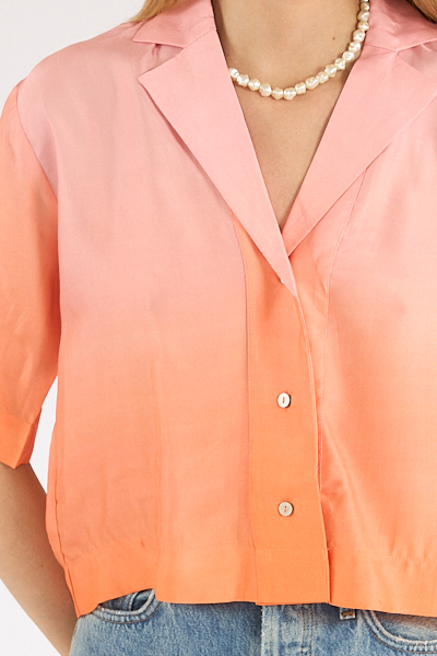This cropped button-up features a striking ombré gradient that adds depth and movement. Designed with short sleeves and a tailored fit, it’s perfect for layering or wearing on its own—pair it with the Aria Skirt for a coordinated set.