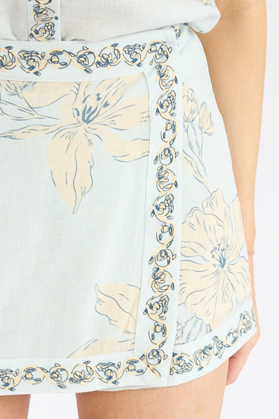 The Sophie Skort is a linen blend mini with a front flap closure and all over floral embroidery.