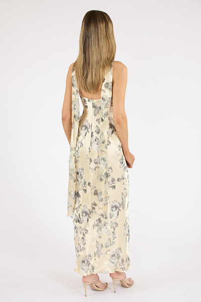 Featuring a scarf like neckline that drapes gracefully down your back, the Ashton textured satin dress is made for grand entrances.