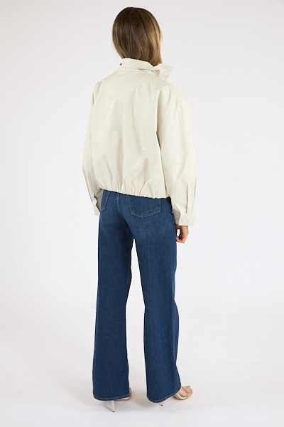 This chic funnel neck jacket has a cropped oversized silhouette and cinched hem.