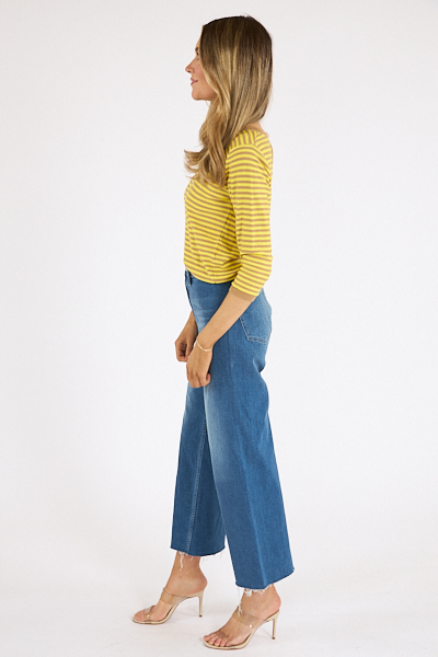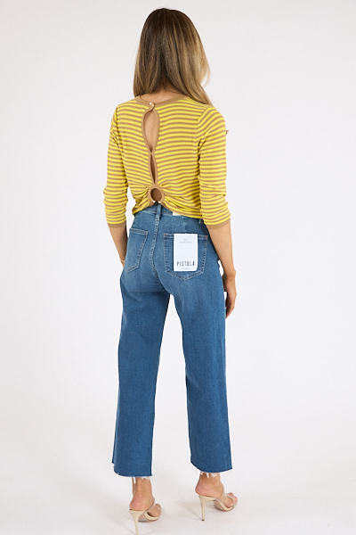 The Naxos Sweater is a stripe style with a 3/4 sleeve and back cut out details.