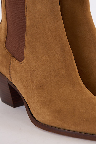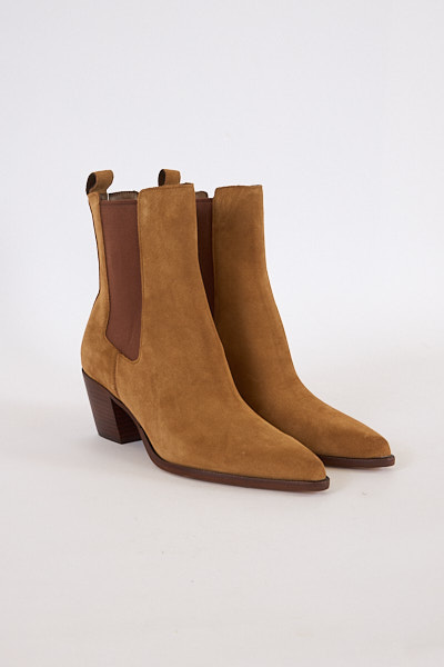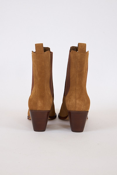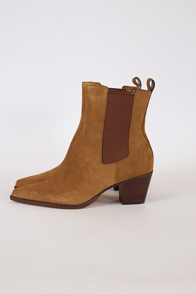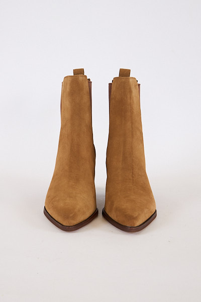 The Shadie is a pointy toe bootie with an angled block heel, stretchy gore panels and back pull tab.