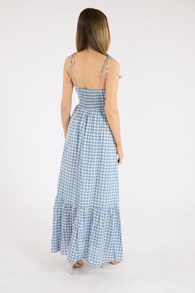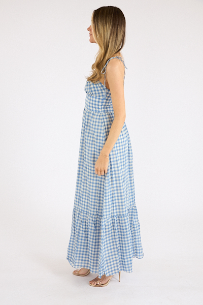 A flowing gingham maxi with dainty tie straps and a bustier style bodice.