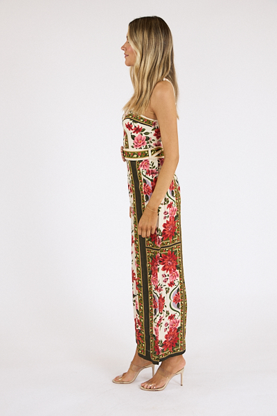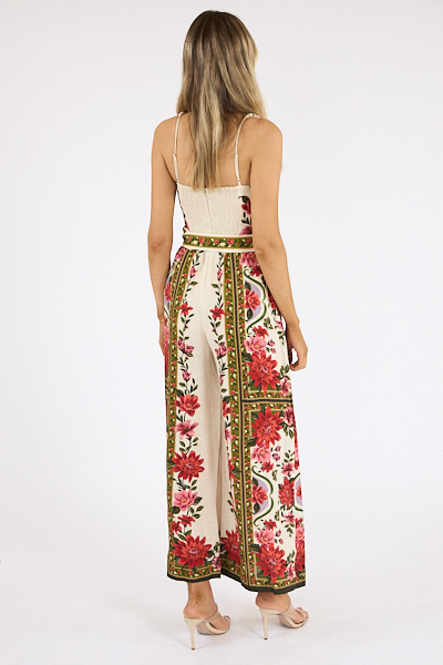 The Wonder Rio Jumpsuit features a captivating sweetheart neckline, cropped wide leg and waist cinching belt.