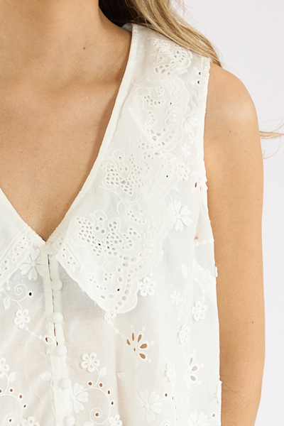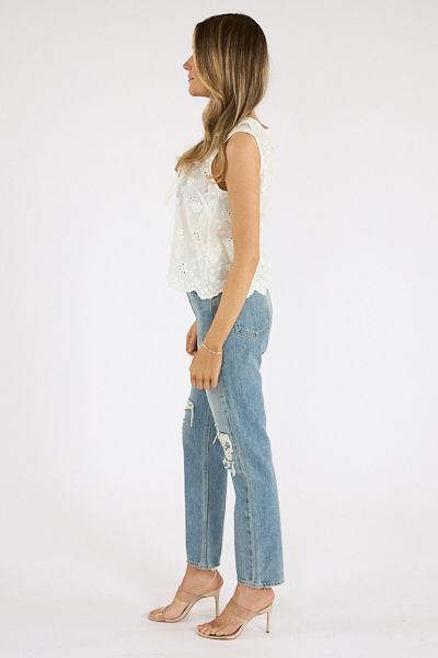 The Marley Top, is made from a delicate cotton eyelet that features floral embroidery.
