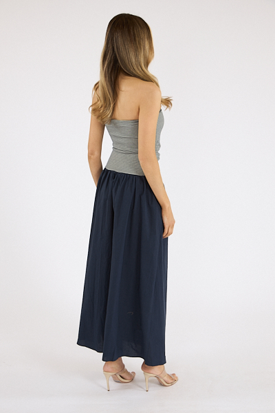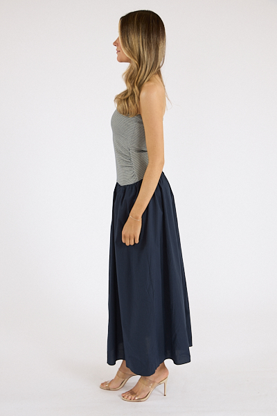 The Mikella Dress features a strapless fitted bodice with a flowing indigo skirt for an effortless, feminine contrast.