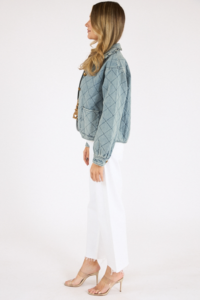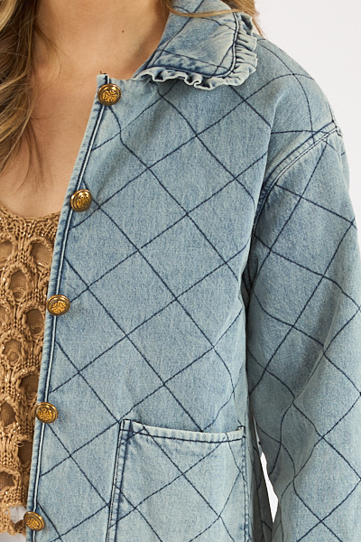 The Miller Jacket is a relaxed fit, quilted denim jacket featuring novelty buttons and a self ruffle around the collar.