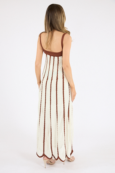 The Cacao Knit Maxi Dress combines an open weave with a straight neckline and wide straps.