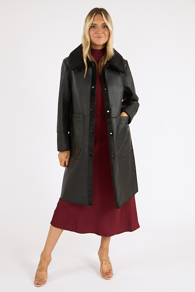 A Faux leather trench coat with faux fur accents, oversized front pockets, and tonal hardware.