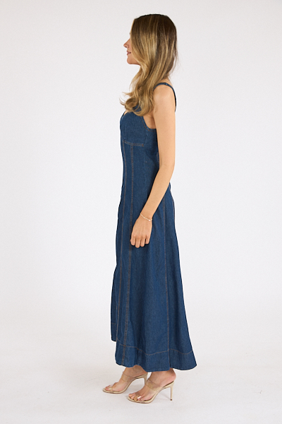 This Denim Midi is designed with a corset-style bodice that contours through the waist before flowing into a relaxed skirt.