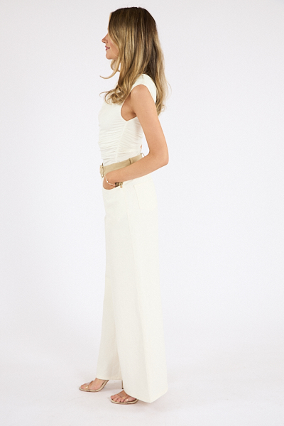 The Sami Denim is a bright ivory pant with a contrast khaki waist detail and long fit.