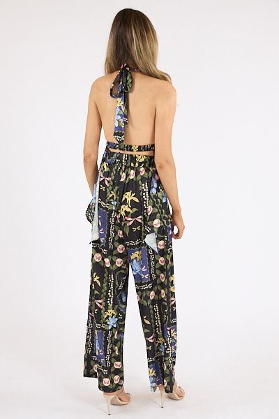 The Ora top is a halter-style scarf silhouette cut in a vibrant butterfly printed satin while featuring a double tie back and an elasticized band for a secure fit.
