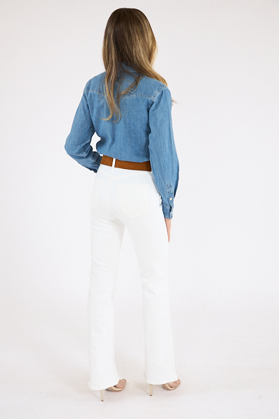 A Western-inspired denim button-up with curved patch pockets and a curved hem.