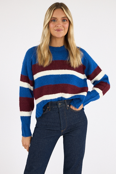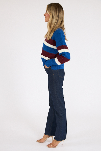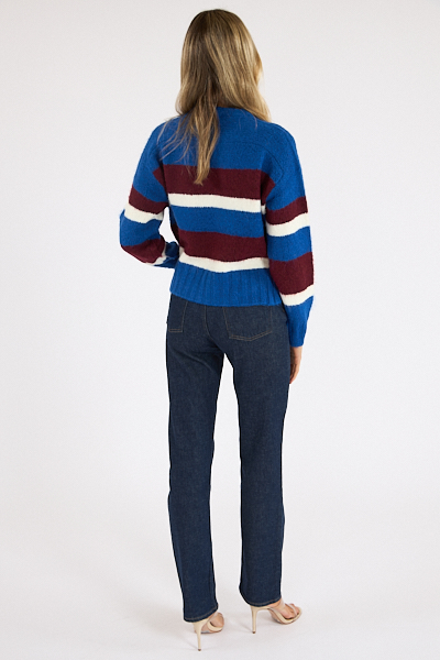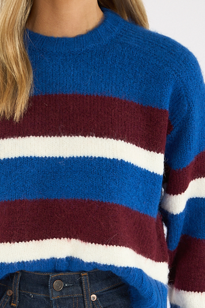 The Adina Sweater is designed with a monochromatic rib trim, an elongated crop proportion and split hem that grazes the waistband.