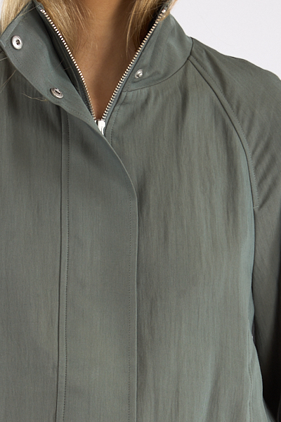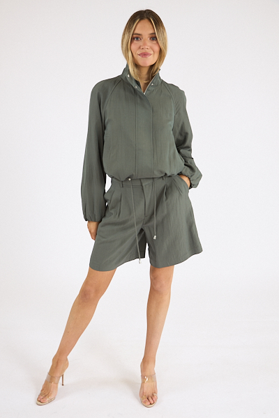 The Blake Jacket has a relaxed, oversized fit with a high funnel neck and double button closures, long dropped-shoulder sleeves, and a cropped drawstring hem.