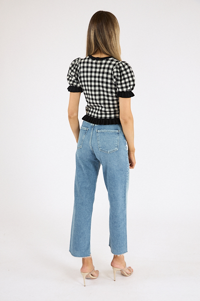Dessa is a gingham print knit with a ruffle hem detail and button front silhouette.
