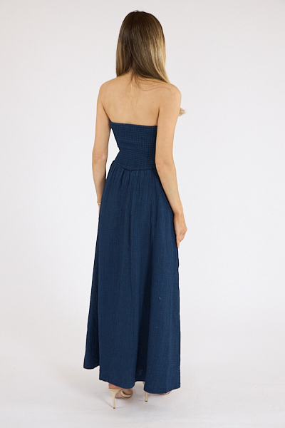 The Runa Dress is a strapless silhouette that highlights the texture of a rich indigo gauze.