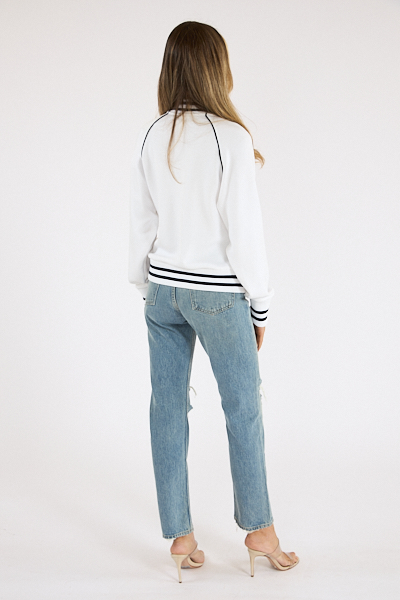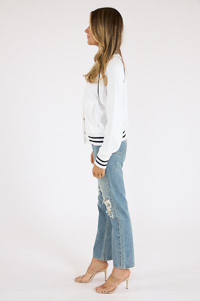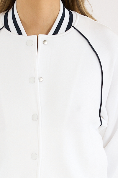The Jepson Club Jacket is a double soft bomber complete with a press stud closure and striped rib trims.