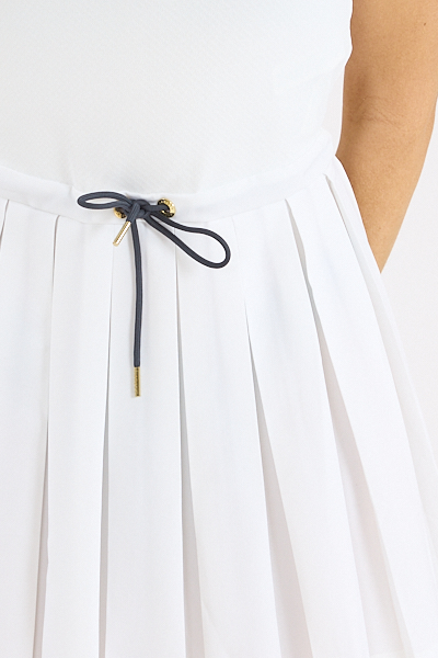 The Nico dress features a drawcord fastening, a pleated skirt, and contrast collar with a half-zip fastening.