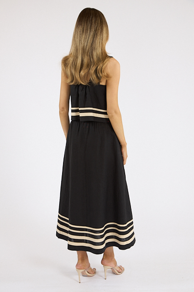 Lucille is a pull on skirt featuring a flat front and elasticized back waist and contrast taping.
