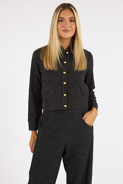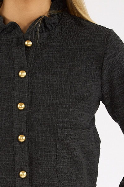 Maggie is a classic cardigan with patch pockets, a ruffle collar, and elevated gold buttons.