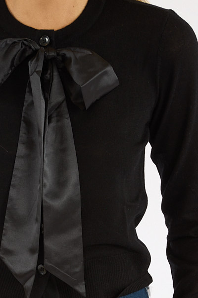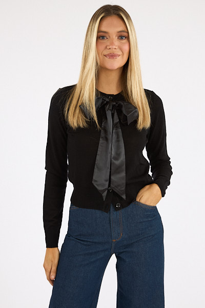 The Take A Bow Cardigan is a slim-fit, cut from soft merino wool, and finished with satin buttons and a detachable satin bow.