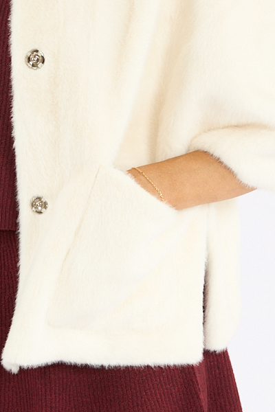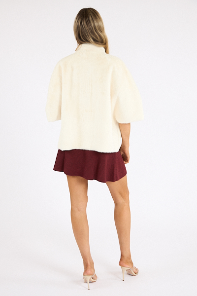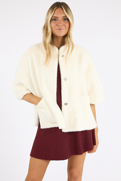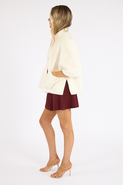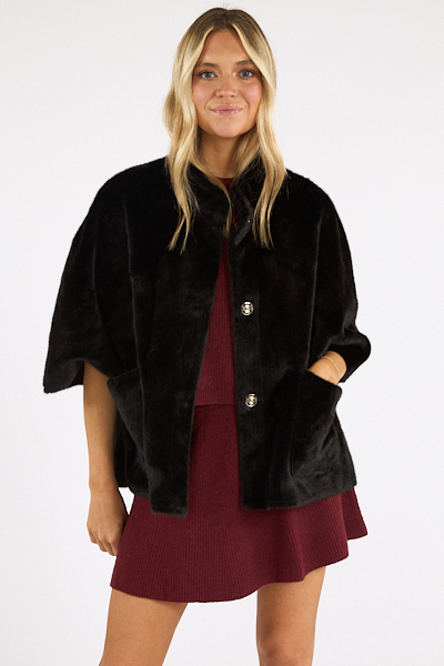 Violet faux fur cape coat, stand collar, front snap closure, front pockets, side slits, loose fit.