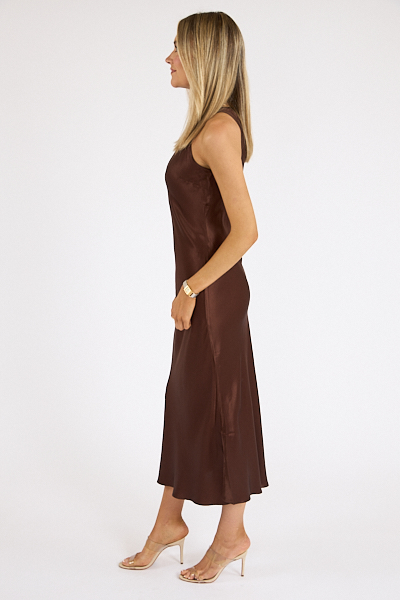 The Solene is a lightweight satin crepe midi with a unique lustrous look and an adjustable keyhole closure at back.