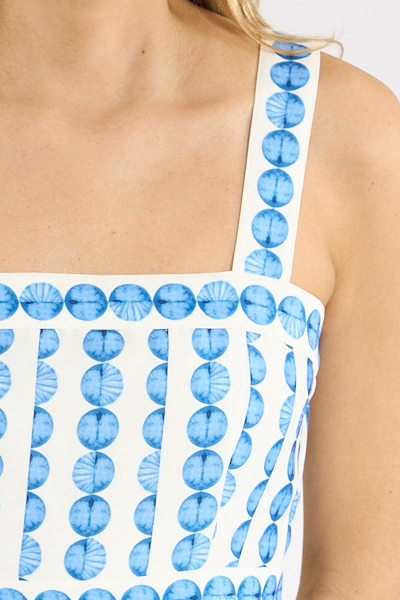 A structured taffeta mini dress with a geometric print fabrication and a square neckline.