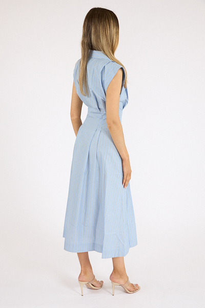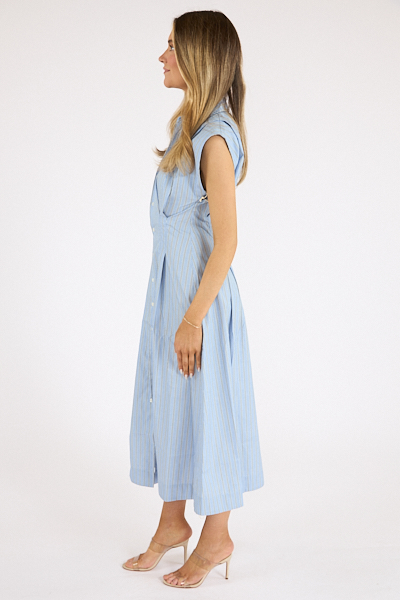 A sleeveless button-up dress with a collared neck, fitted waist and a flowy A-line skirt that hits at the calf.
