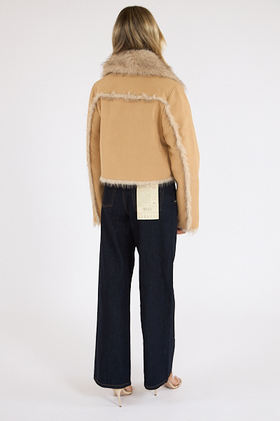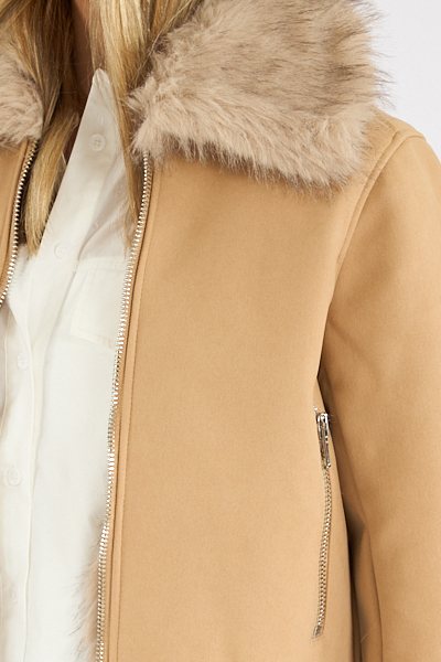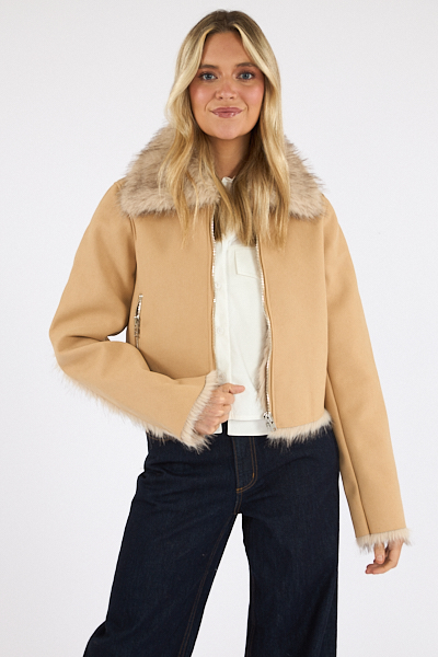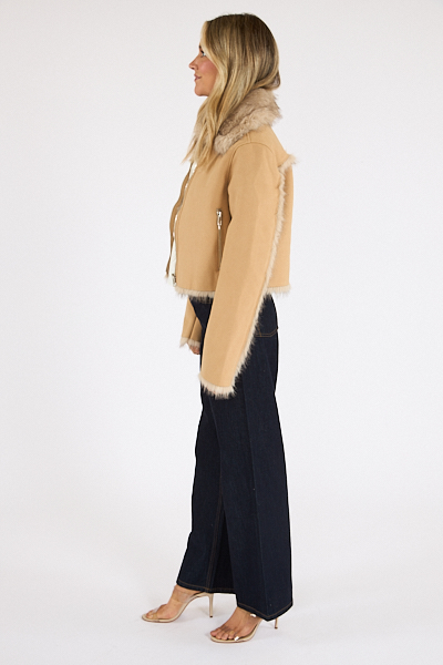 The Aaliyah is a luxe faux fur lined suede jacket with silver hardware details.
