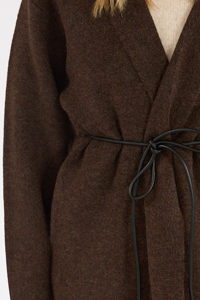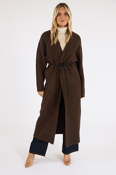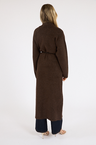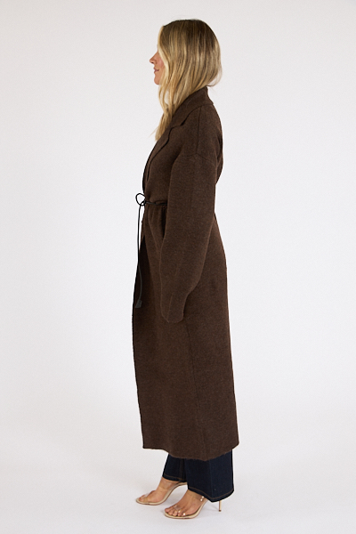 The Emrys is a brushed yarn cardigan designed with a full-length body, blazer-inspired collar, and side pockets.
