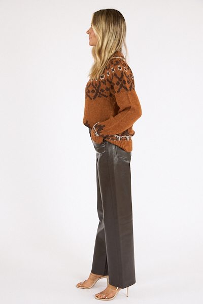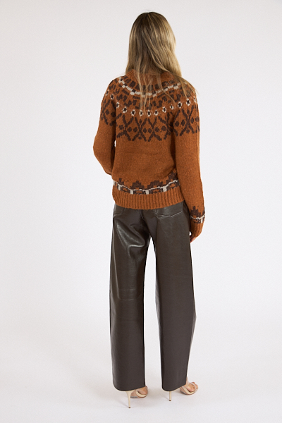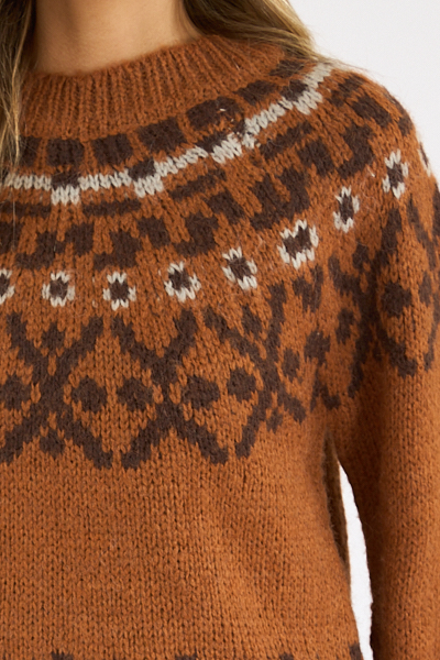 A mid weight knit fair isle sweater with a round neckline.