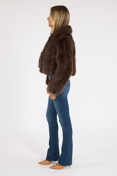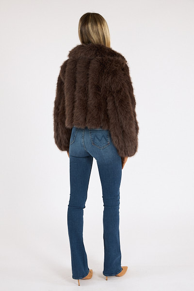The Jax Jacket is a faux fur cropped layer made in a rich chocolate brown with leather accents.