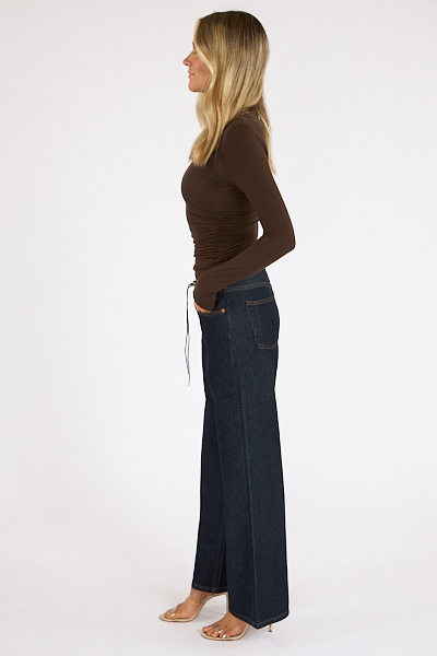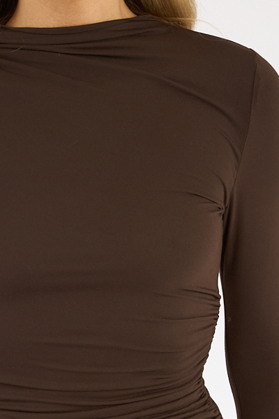 A modern take on the classic long sleeve, the Joelle top is crafted from a soft gauge jersey with an asymmetrical mock neck with shirring details from the right shoulder.