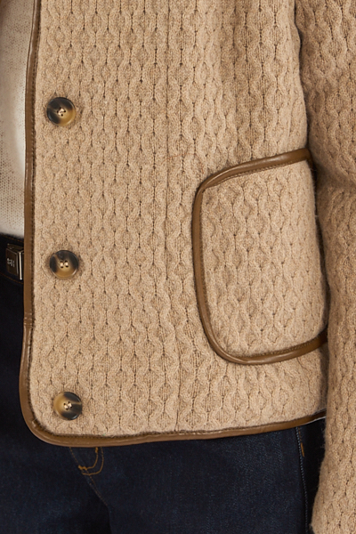 The Loop Jacket is a sweater knit padded silhouette with contrast leather piping and button details.
