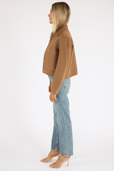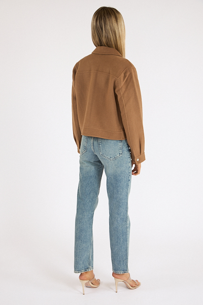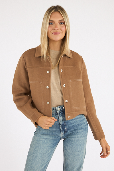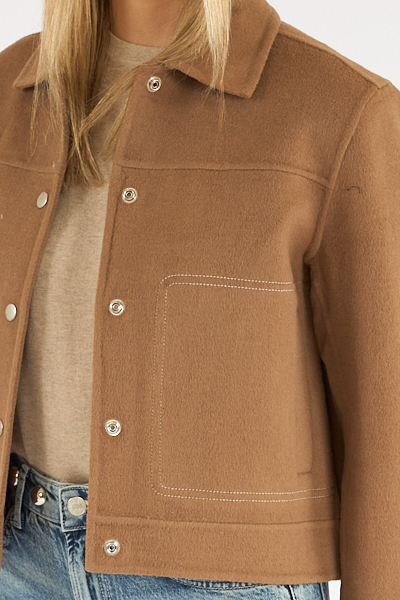 The Mountain Jacket is made from a heavy wool blend with a boxy fit, exposed stitching and yoke details.