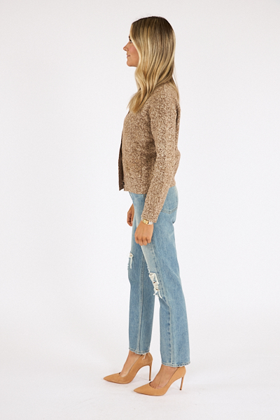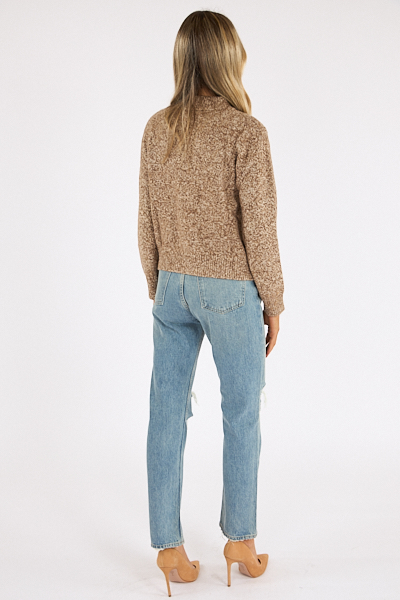 The Olvera is made from a buttery soft marl knit with a stand collar, front button closures, and patch pockets.