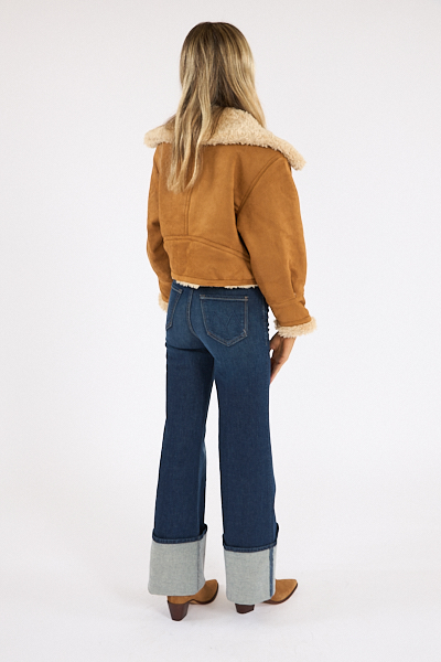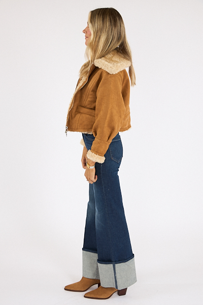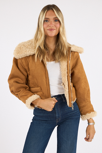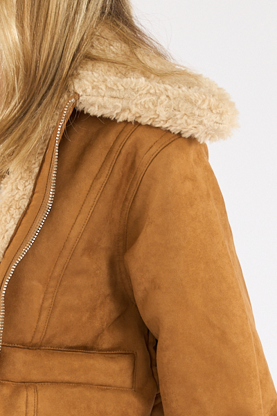 The Shearling Faux Fur Jacket is a cool cropped layer with a shearling lining and rich suede outer.