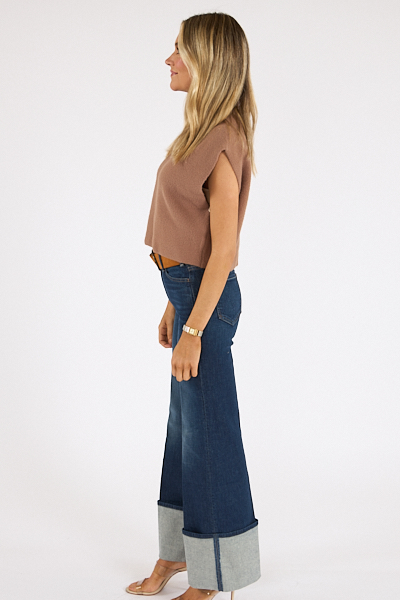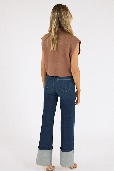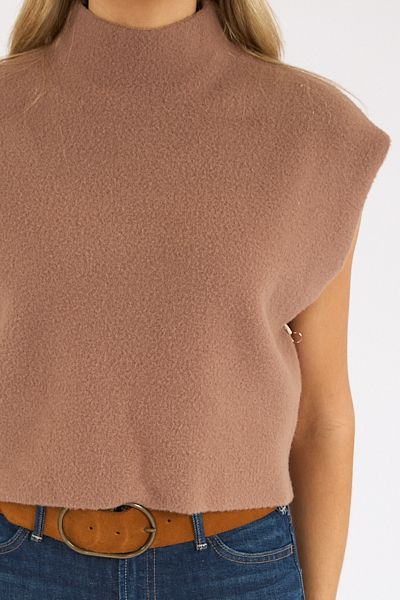 This sleeveless sweater is slightly cropped and boxy. This sweater features a mock neck, making it a perfect transitional sweater going into cooler weather.