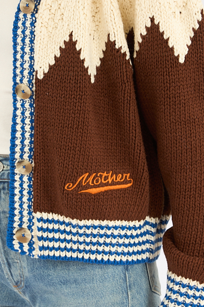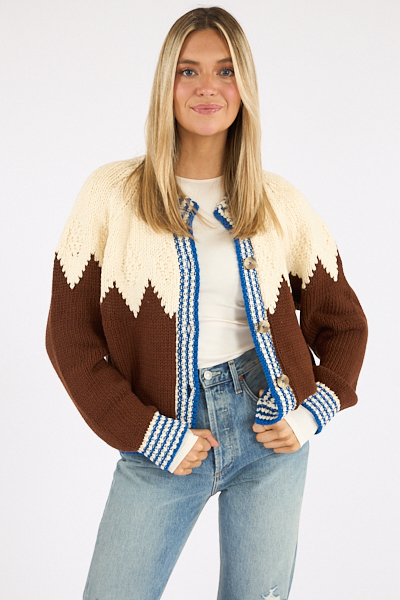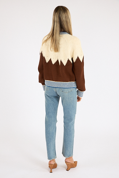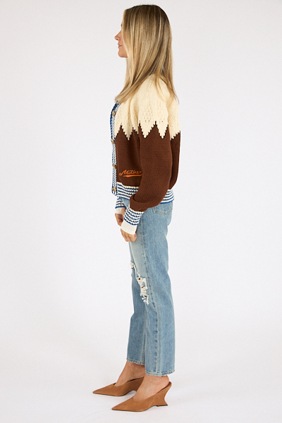 A raglan cardigan sweater with a crewneck, zig zag pattern and cropped white striped hems.