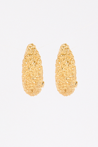 A chunky hoop earring with molten texture and an embossed logo on the front.