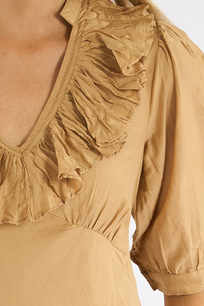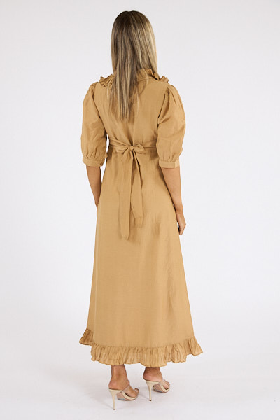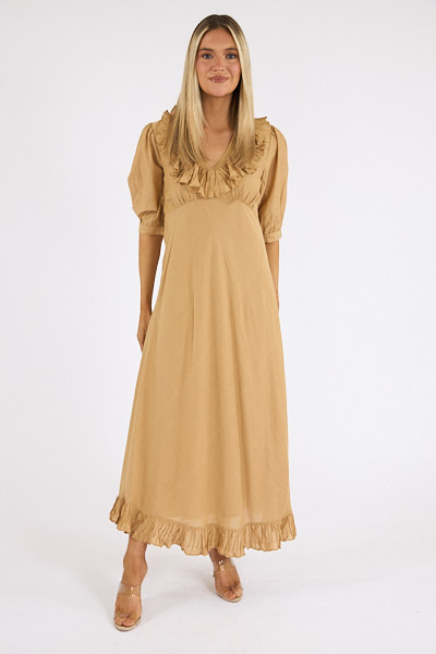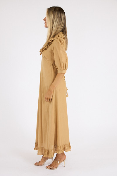 The Salona dress is an easy maxi with ruffled accents and a cuffed sleeve.