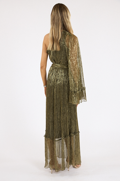 The Wonder Maxi is a flowy one shoulder dress with delicately ruffled edges and sparkle for that little extra oomph.