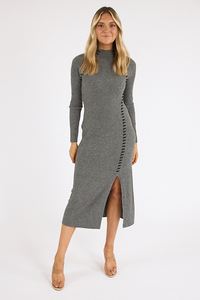 The Imara is a midi-length sweater dress designed with a funnel neckline, fitted silhouette and subtle slit.