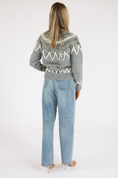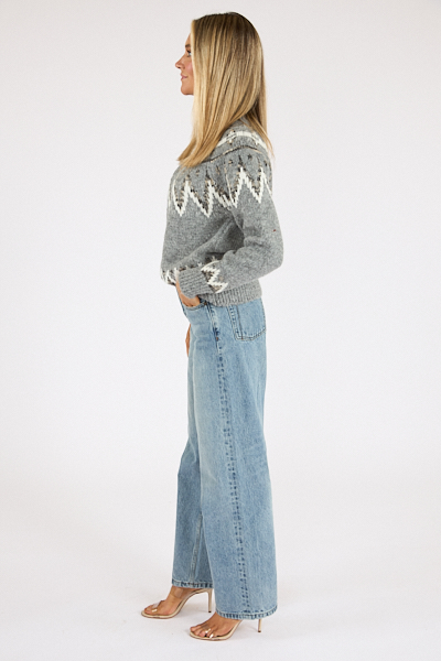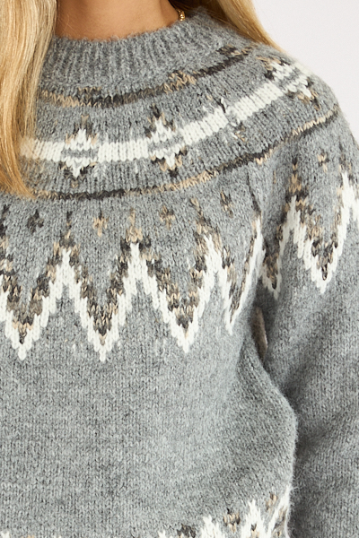The Rae Sweater features an oversized, fair isle pattern across the chest and hem.