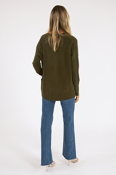 Wagner is an oversized v-neck button down cardigan with long sleeves and curved long back hem.