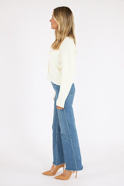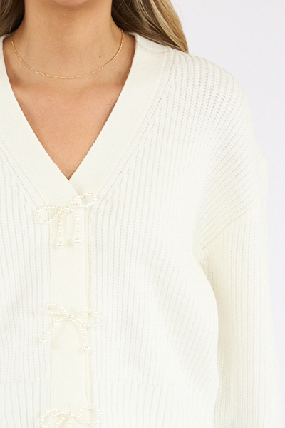 The Babysoft Bow Sweater adds a playful twist to your knitwear rotation, designed with a relaxed fit and charming pearl-adorned bows down the front.