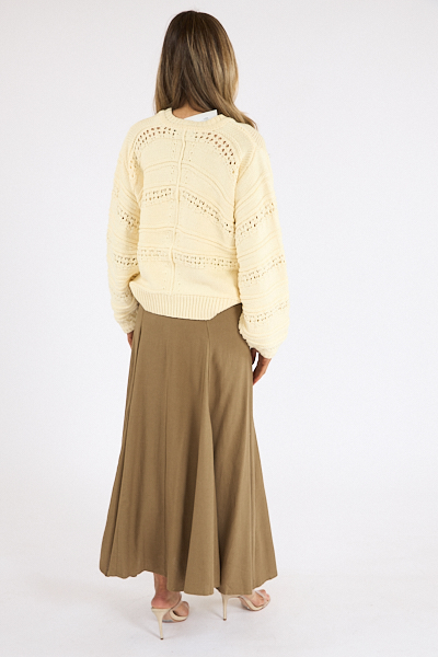 The Faial Sweater is a chunky knit sweater with a round neckline and long balloon sleeves.